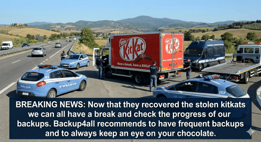 BREAKING NEWS: Now that they recovered the stolen kitkats we can all have a break and check the progress of our backups. Backup4all recommends to have frequent backups and to always keep an eye on your chocolate.